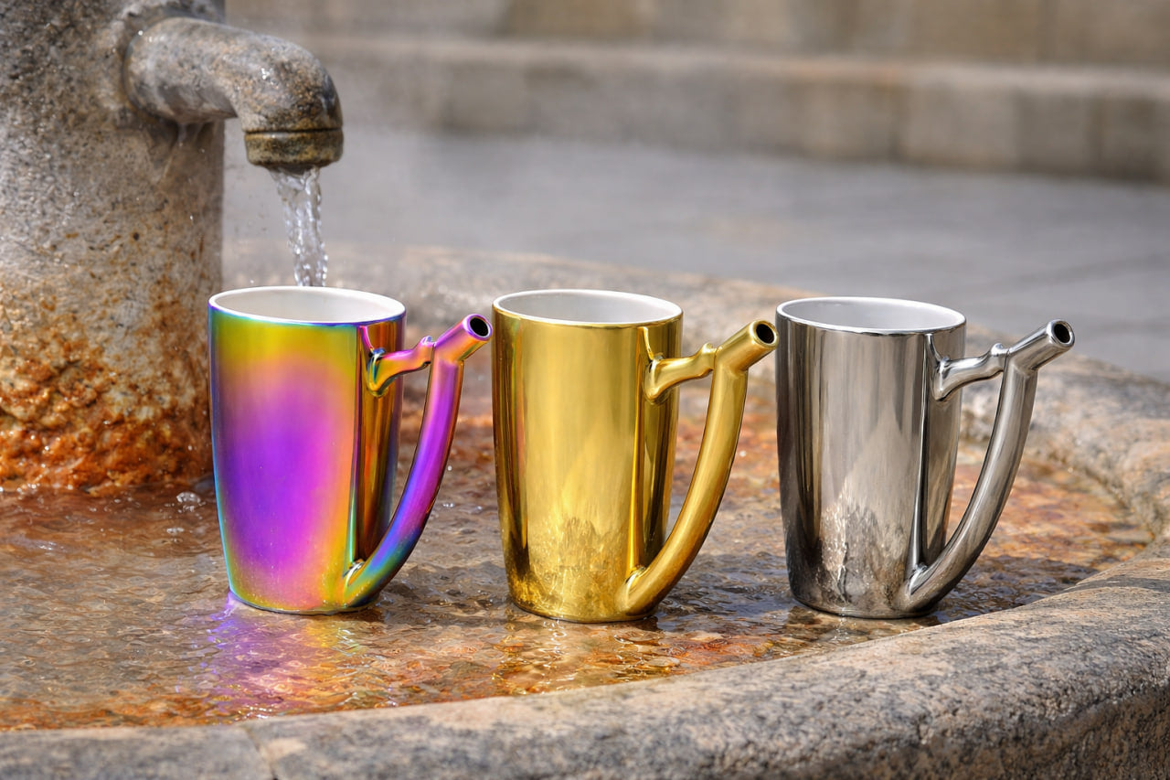 Zlatý karlovarský lázeňský pohárek je ikonickým symbolem lázeňské tradice Karlových Varů. Speciální tvar s typickým náustkem umožňuje pomalé a správné popíjení minerální vody během procházek po kolonádách – přesně tak, jak se to zde dělá už po staletí.