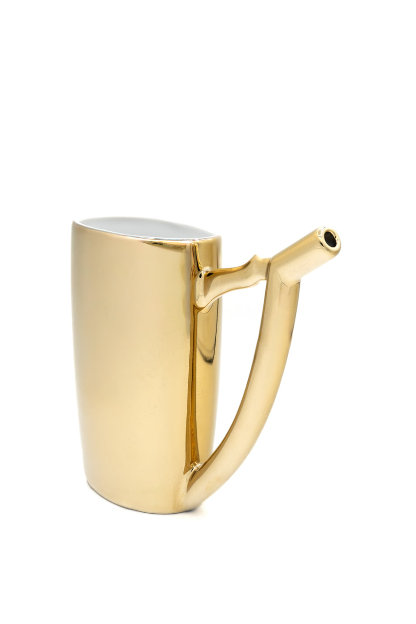Pohárek je vyroben v České republice z kvalitního porcelánu a doplněn elegantním zlatým metalickým povrchem, který klasickému lázeňskému designu dodává moderní a luxusní charakter. Ergonomické držadlo zajišťuje pohodlné držení i při delším používání.