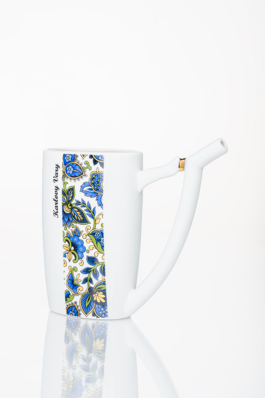 Každý kus je ručně vyrobený a zdobený květinovým autorským vzorem, díky čemuž nejsou žádné dva šálky úplně stejné. Rafinovaná ornamentika, inspirovaná klasickými evropskými dekorativními motivy, proměňuje tento lázeňský šálk ve funkční umělecké dílo a sběratelský suvenýr.