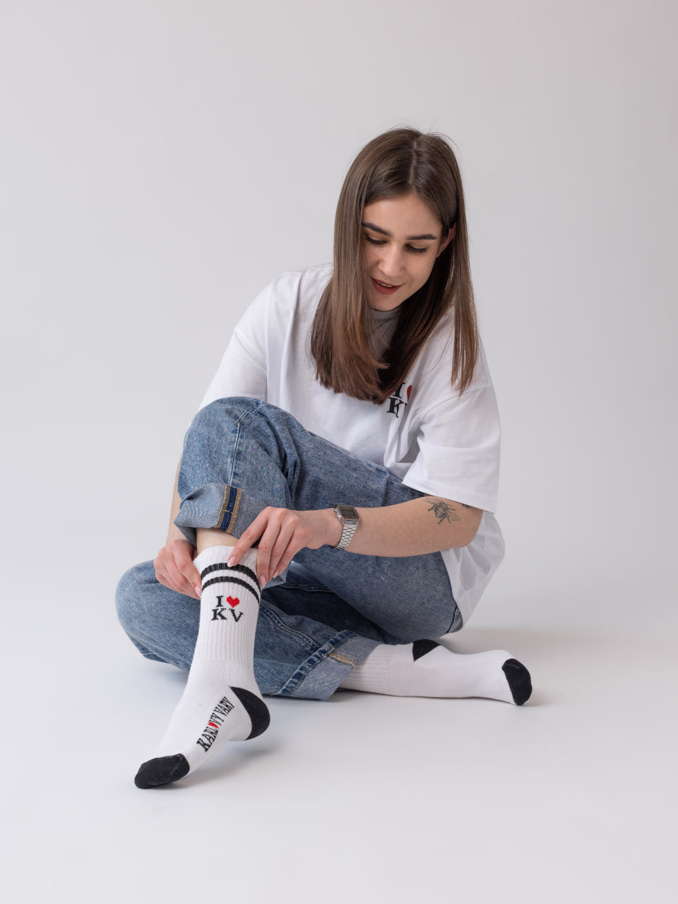 Stylové ponožky I ❤️ KV jsou moderním vyjádřením vztahu ke Karlovým Varům — navržené pro každodenní nošení, ne jen jako suvenýr. Čistý kontrast bílé a černé barvy, ikonický symbol srdce a precizní zpracování vytvářejí doplněk, který se snadno kombinuje s městským i sportovním stylem.