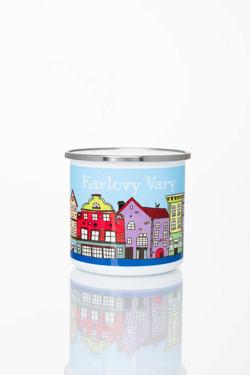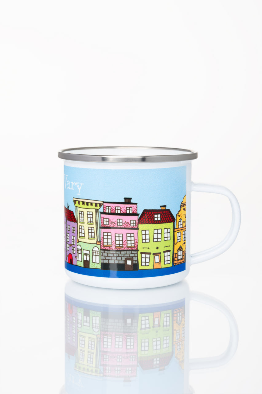 Přineste si domů kousek Karlových Varů s tímto kompaktním smaltovaným hrnkem na památku. Je lehký a praktický a obsahuje zářivou ilustraci ikonické architektury lázeňského města – okouzlující připomínku historického centra a jeho jedinečné atmosféry.