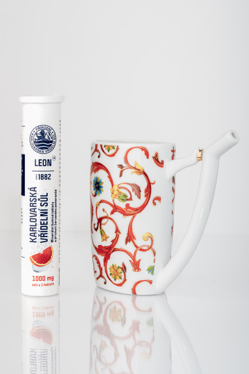 Typický tvar s náustkem je navržen pro správné popíjení minerální vody během lázeňských procházek po kolonádách. Právě z těchto pohárků se v Karlových Varech po generace pije termální voda při tradiční pitné kúře. Pohárek je vyroben z kvalitního porcelánu v České republice. Dekor je ručně aplikovaný, což činí každý kus originálním. Tato edice je navíc vyráběna jako limitovaná série a je ideální nejen pro minerální vodu, ale také pro přípravu a konzumaci karlovarské pitné soli.