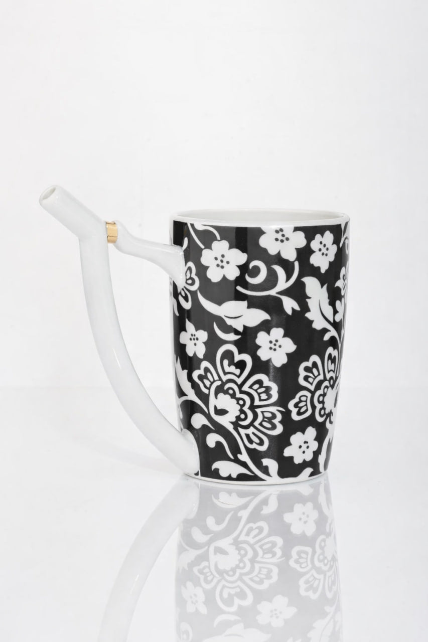 Tento karlovarský lázeňský pohárek „Černobílá bohémská zahrada“ spojuje tradiční lázeňskou kulturu Karlových Varů s elegantním černobílým ornamentem inspirovaným klasickým českým a bohémským porcelánem.