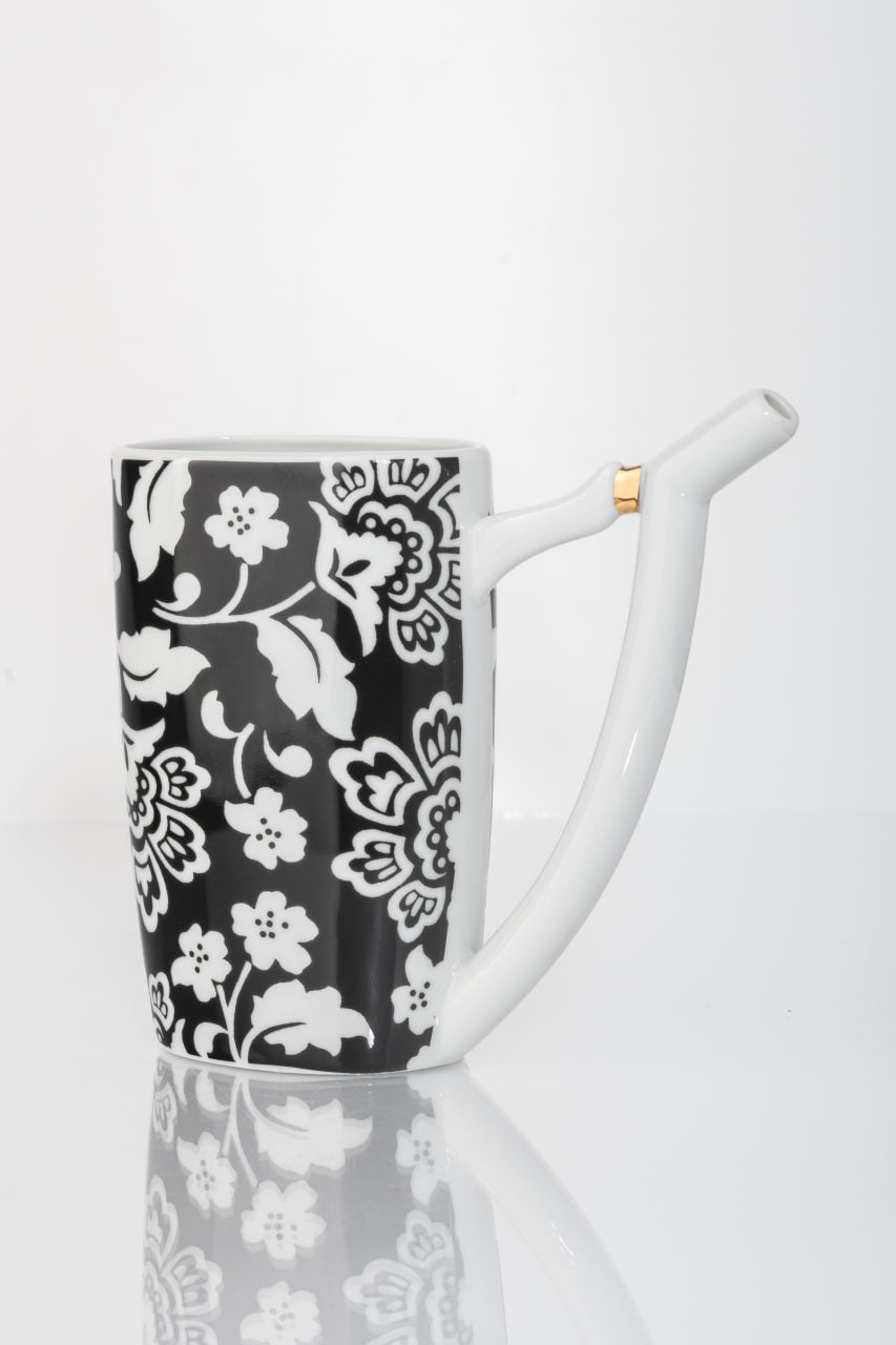 Autorský dekor „Černobílá bohémská zahrada“ přináší moderní kontrastní estetiku do klasického karlovarského lázeňského pohárku a vytváří harmonické spojení tradice a současného designu.