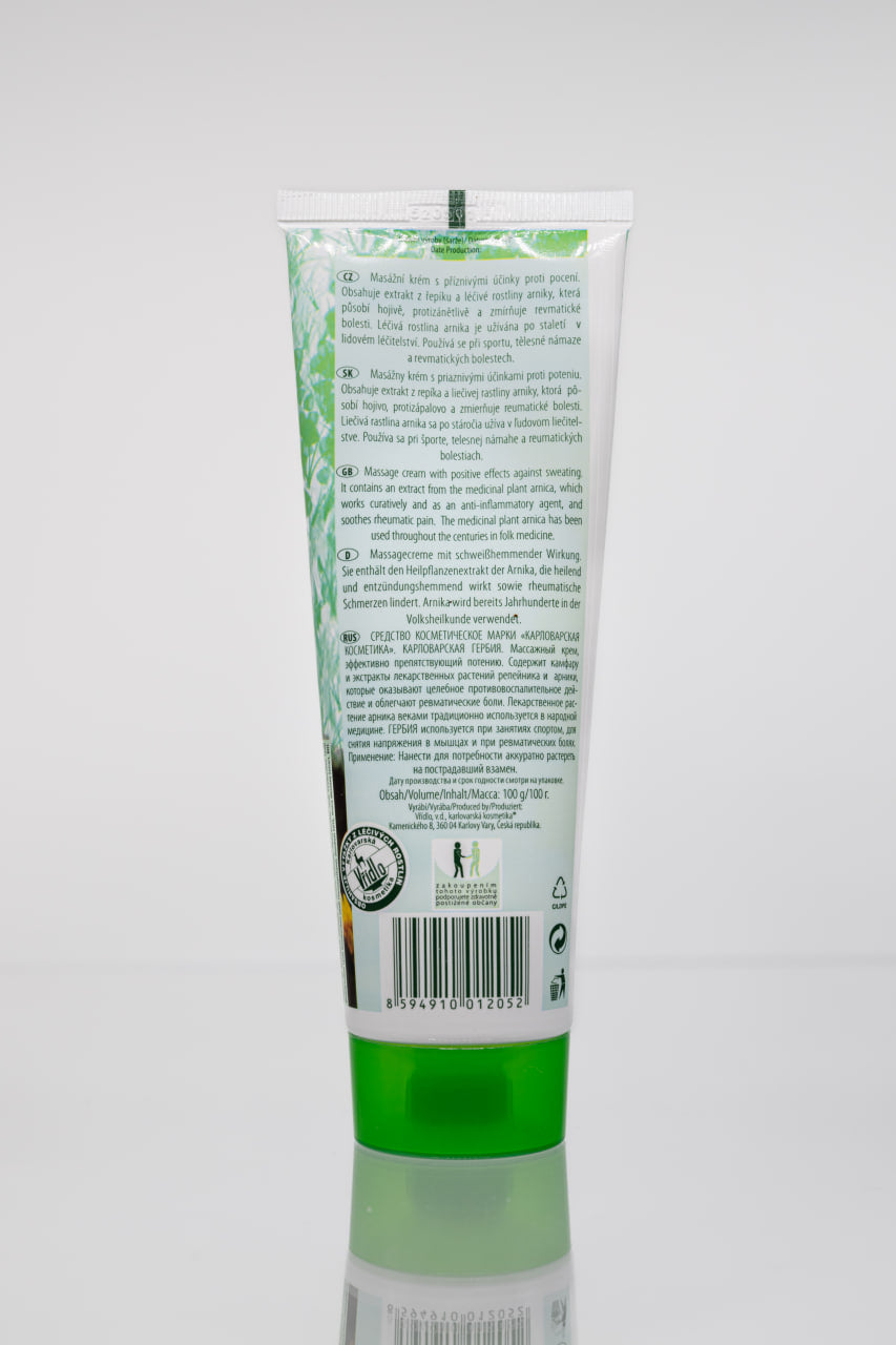 Травяной массажный крем для мышц и суставов, обогащённый камфорой, арникой, розмарином, чабрецом и эвкалиптом — создан по мотивам традиций лечебной косметики Карловых Вар.
